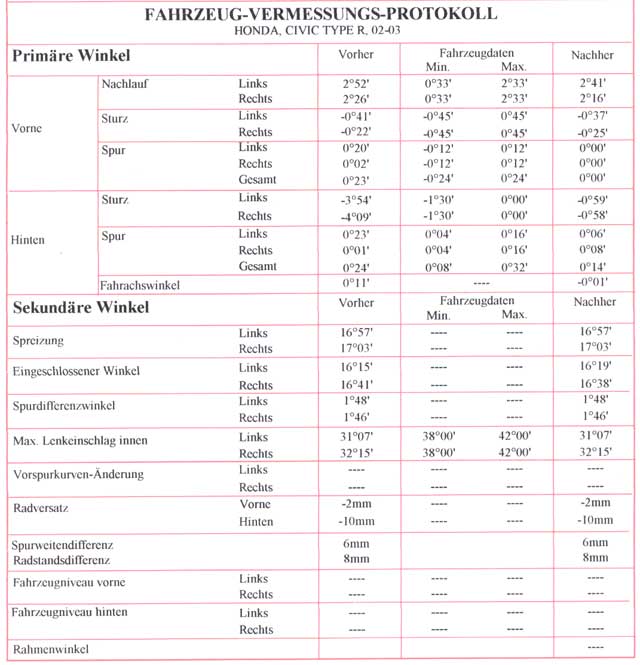 vermuteten -2,5° sondern bei vollen -4,0°. Durch den Umbau ist der Sturz nun auf -1,0° an der Hinterachse korregiert.